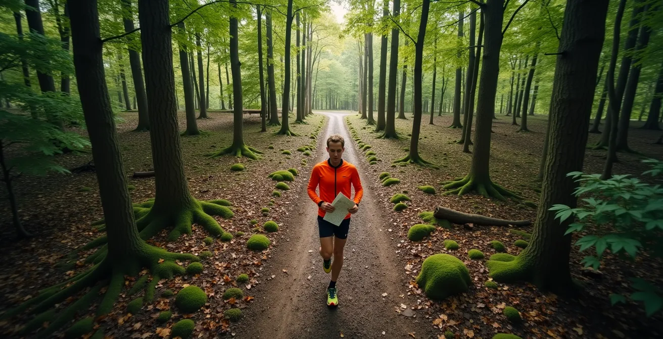Vous êtes un sportif accompli, vous enchaînez les kilomètres et les défis physiques, mais une simple carte et une boussole suffisent à transformer une forêt familière en un labyrinthe inextricable. Cette frustration de tourner en rond, de chercher une balise qui semble s’être volatilisée, est une expérience partagée par de nombreux débutants en course d’orientation. C’est le paradoxe de ce sport : il met autant à l’épreuve l’intellect que le physique. Beaucoup pensent que la solution réside dans un meilleur équipement ou une lecture plus assidue de la légende. On vous conseille d’orienter votre carte, d’utiliser votre pouce, de bien choisir votre itinéraire.